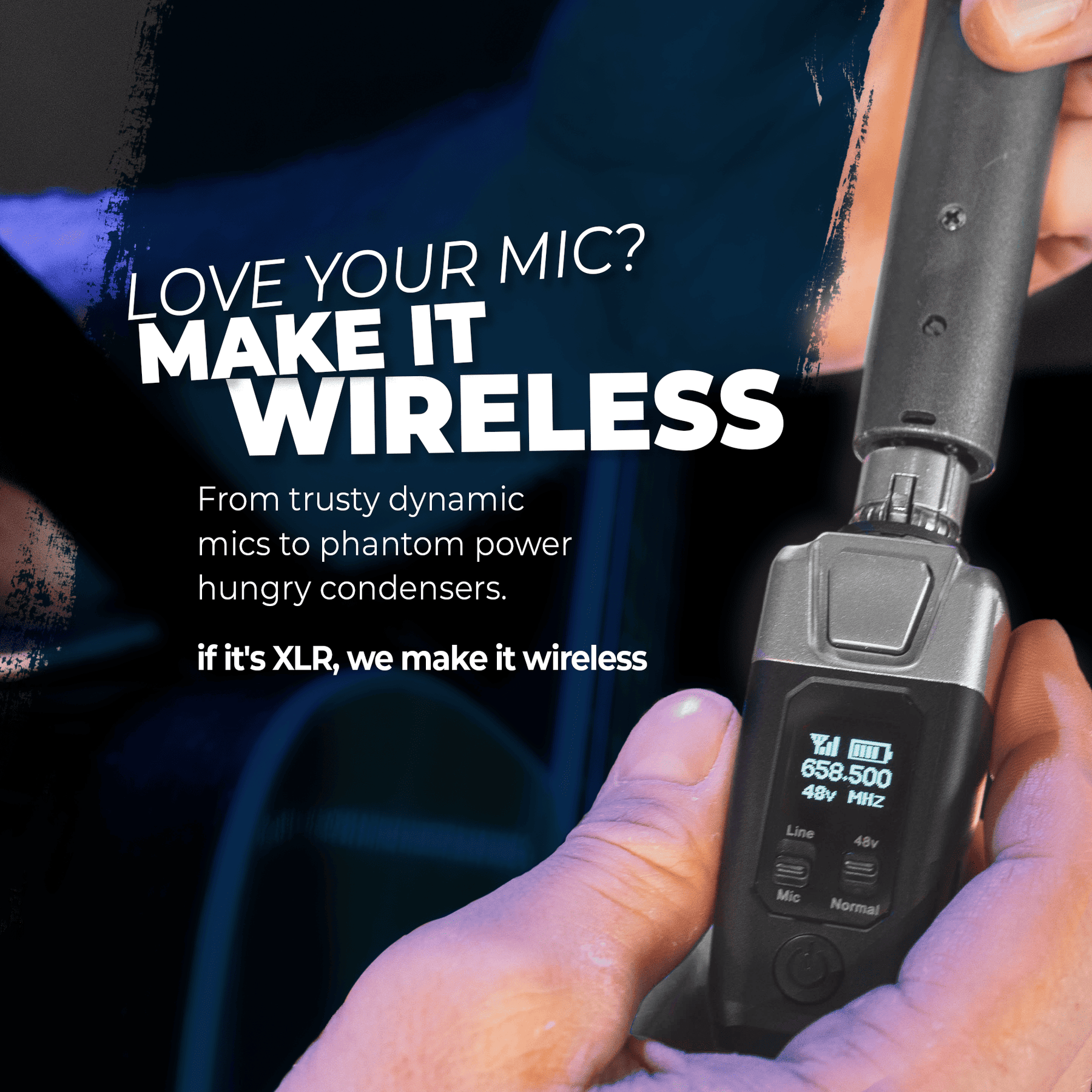 Turn any XLR microphone or powered speaker wireless in seconds.